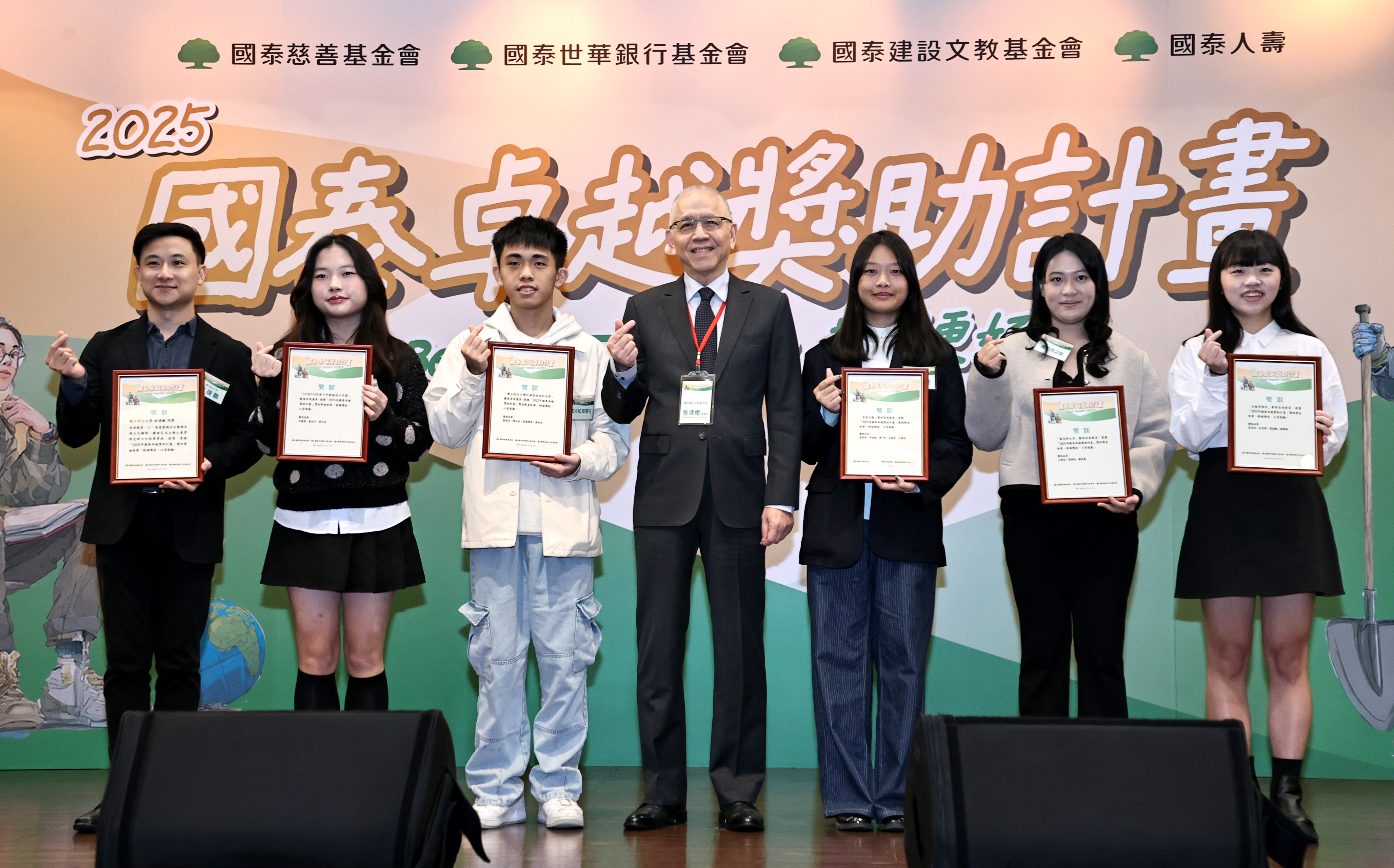 2025年國泰卓越獎助計劃頒獎典禮於12月3日國泰金融會議廳盛大舉行,由張董事長頒發特色獎助類並與得獎學生合影留念。